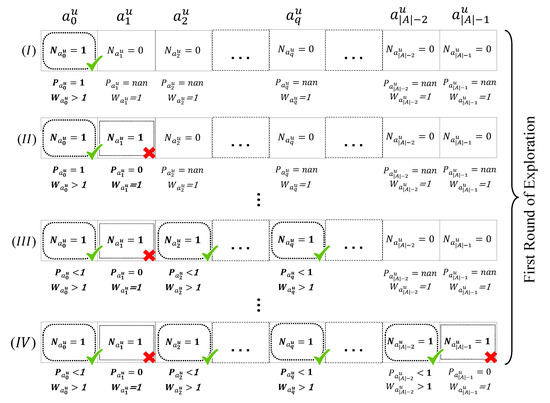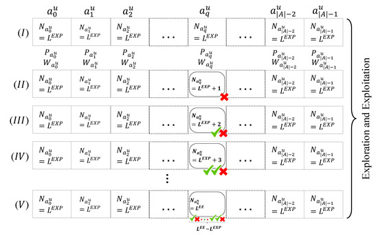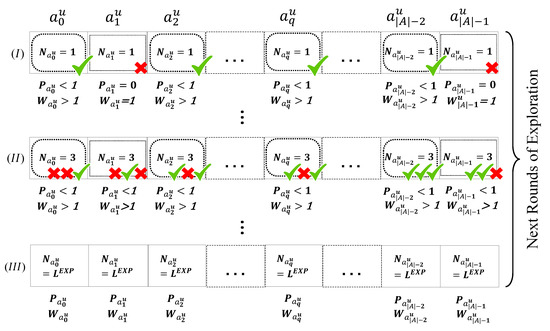 t is incremented by one, so that the exploration phase can start again for a new transmission period. In this way, the actions that were removed from the previous execution will have a second chance. Note that all actions will have their