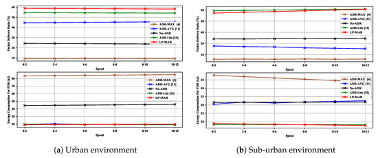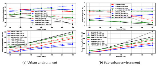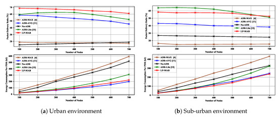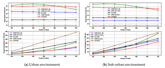 Figure 8b, we illustrate the PDR and EC in ADR-MAX, ADR-AVG, No-ADR, ADR-Lite, and LP-MAB in Scenario 1, for a sub-urban environment with a radius of 9800 m. It can be seen that, due to the greedy manner of decision-making in ADR-Lite, it is possible to achieve a higher level of PDR, regardless of the network density, at the cost of a higher EC. Also, in the No-ADR scheme, because of its randomness and its lack of consideration for environmental changes, the result is entirely dependent on the initial transmission parameter values. Therefore, the No-ADR scheme achieves a better performance in the sub-urban environment compared to the urban environment. As a result of applying machine learning techniques such as RL, the NS can converge to the optimal state in terms of TP, resulting in the lowest EC of LP-MAB compared to other approaches. Another pertinent observation from