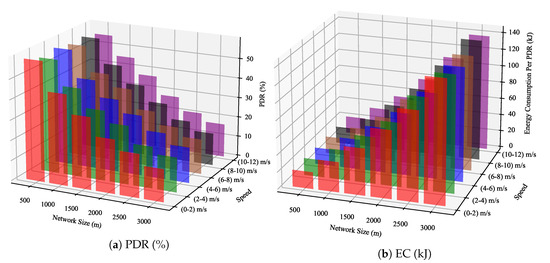Figure 12 shows the PDR and EC of the LP-MAB scheme for a variety of network sizes (small and large network areas) using 100 EDs, for different mobility speeds, based on the Random Waypoint Mobility Model [