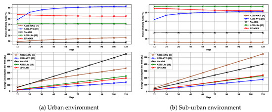 Figure 13, we illustrate the PDR and EC of different algorithms versus the number of simulation days for the 100 static EDs used in Scenario 6. According to the results, ADR-AVG performs better than other ADR mechanisms in terms of PDR in urban environments, as well as in terms of EC in both urban and sub-urban environments. It should be noted that these performance results were achieved in a low-density deployment of EDs. This may be incongruous with most IoT applications, requiring several hundred EDs, for which, as demonstrated in Scenarios 1 and 3, the performance of ADR-AVG may not be satisfactory.