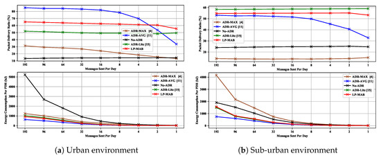 Figure 8a shows the PDR and EC in ADR-MAX, ADR-AVG, No-ADR, ADR-Lite, and LP-MAB in Scenario 1, for an urban environment with a radius of 480 m and