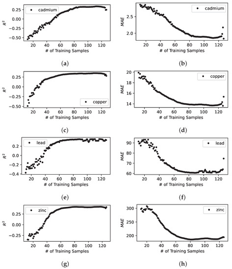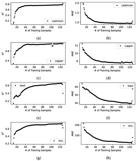 Standalone prediction model built with active learning. The figures show and MAE for predicted heavy metal concentrations on the evaluation data set. (a) for predicted cadmium concentration; (b) MAE for predicted cadmium concentration; (c) for predicted copper concentration; (d) MAE for predicted copper concentration; (e) for predicted lead concentration; (f) MAE for predicted lead concentration; (g) for predicted zinc concentration; (h) MAE for predicted zinc concentration.