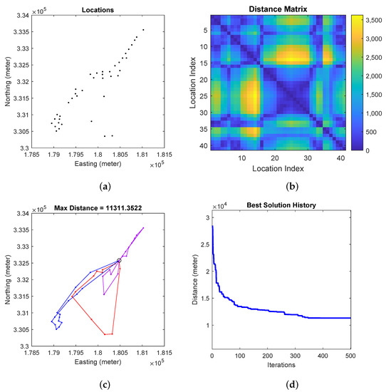 Generating robot paths for robots. (a) Sensing locations to be visited by the robots; (b) Distance matrix between any two sensing locations where a location is represented by its index. (c) Paths traveled by the robots when the total distance is minimized. We differentiate the paths of the robots using three different colors. (d) Total distance history over path planning iterations.