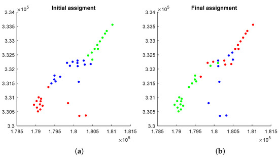 Sensing location assignments. We use three colors to differentiate assignments to the robots. (a) Initial sensing location assignment; (b) Final sensing location assignment.