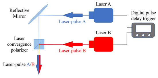The design of the double-pulse laser standard excitation signal generation system is displayed in Figure 3. The system comprised a digital pulse delay trigger and a double-pulse laser. The double-pulse laser was constituted by two pulsed lasers A and B. The beam from laser A is reflected by a reflector to a laser beam polarizer and the beam from laser B is directed at the laser beam polarizer. The laser beam polarizer selectively enables the vibration of the beam in a certain direction by allowing the beam from laser A to pass through the laser beam polarizer and blocking and reflecting the beam from laser B. Thus, the beams from the two lasers combine to ensure that both pulsed laser beams irradiate the same temperature-sensing area of the microsecond temperature sensor.