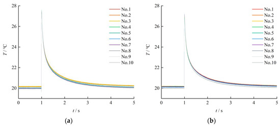 Single-pulse laser method has become one of the hottest methods of dynamic calibration of thermocouples, including S-type [18], N-type [19] and K-type [20] thermocouples. In order to facilitate comparison, the time constant of the SA1-K thermocouple under single-pulse laser excitation was measured by using the proposed double-pulse laser calibration system. The thermocouple was fixed on the test stand and positioned at the focal point of the lens by adjusting the high-precision displacement and the beam-expanding focusing optical path of the laser. The double-pulse laser was controlled using a trigger to emit only one laser beam, thereby realizing single-pulse laser excitation. The two pulsed lasers A and B constituting the double-pulse laser were used to excite the SA1-K thermocouple. The energy of the pulsed laser in the experiment was 13.64 mJ. The results of the calibration experiment are illustrated in Figure 4. The experiment was repeated 10 times with each laser; the lines in different colors in Figure 4 indicate different experimental groups. The moment when the response curve reached the peak was the starting point, and the moment when the response curve dropped to 63.2% of the temperature difference was the end point. The time constants of the thermocouple were calculated at these two moments, as summarized in Table 1.