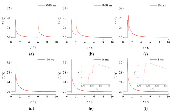 Thermocouple output response curves under double-pulse laser excitation over different time intervals: (a) Time interval = 5000 ms; (b) Time interval = 1000 ms; (c) Time interval = 200 ms; (d) Time interval = 100 ms; (e) Time interval = 10 ms; (f) Time interval = 1 ms.