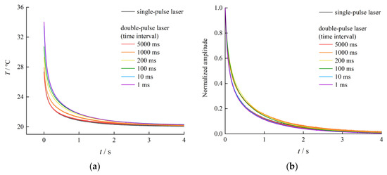 To analyze the dynamic response of a thermocouple under a double-pulse temperature excitation, a digital pulse delay trigger was used to control a double-pulse laser to successively emit two laser beams, each with an energy of 13.64 mJ. The beam from laser A irradiated on the thermocouple to generate a thermal excitation, and the output of the thermocouple was the first pulse response signal. The beam from laser B then irradiated on the thermocouple to generate another thermal excitation, and the output of the thermocouple was the second impulse response signal. Figure 5 displays the output response curves of the SA1-K thermocouple under double-pulse laser excitation over different time intervals. With the decrease in the time interval, the curve of the second impulse response signal of the output response curve moves closer to that of the first impulse response signal. When the time interval reached 1 ms, the second impulse response signal drowned out the first impulse response signal. The comparison of output response curves under single and double pulse laser is shown in Figure 6. The output response curve of the thermocouple is affected by the double-pulse laser excitation, and the effect of the double-pulse laser at different time intervals varies.