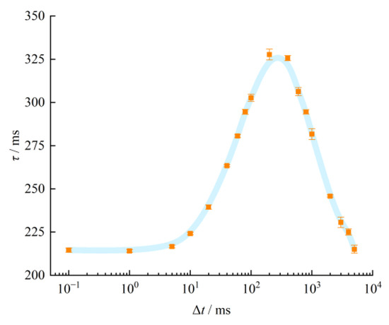 The effects of different time intervals of the double-pulse laser excitation on the thermocouple time constant were quantitatively analyzed. The variations of the time constant of the thermocouple over the time interval of the double-pulse laser are illustrated in Figure 7. The orange dots with error bars indicate the experimentally measured time constants of the thermocouple under the excitation of the double-pulse laser at different time intervals. The blue line represents the trend line fitted through the orange data points. If the time interval was longer than 5000 ms, the time constant was largely unaffected and consistent with the experimental results of the single-pulse laser. When the time interval was between 200 and 5000 ms, the time constant increased with the decrease in the time interval. When the time interval was between 1 and 200 ms, the time constant decreased with the decrease in the time interval. When the time interval was reduced to 1 ms, the time constants obtained through the experiments performed using the single-pulse laser were consistent.