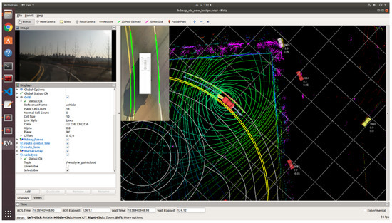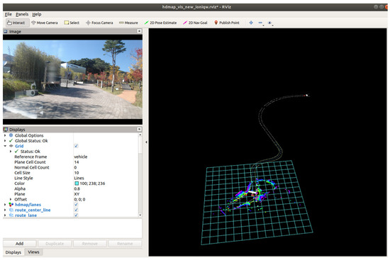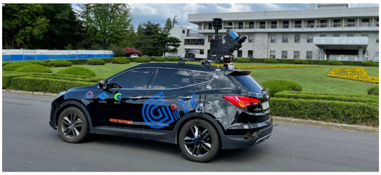 Figure 16 represents the autonomous vehicle that is navigating using a precision map constructed using the proposed system. Utilizing the MMS equipment, the precision map data of the intended route were constructed and fed into the autonomous vehicle. The sensors installed on the autonomous vehicle were employed to recognize the surrounding objects and traffic environment and respond in real time by reflecting the situation in the input precision map. In Figure 17, while the autonomous vehicle is navigating, other vehicles are detected on different paths, and the current driving path only contains roads, with no external objects such as traffic signs or pedestrians present, allowing the vehicle to continue navigating smoothly.