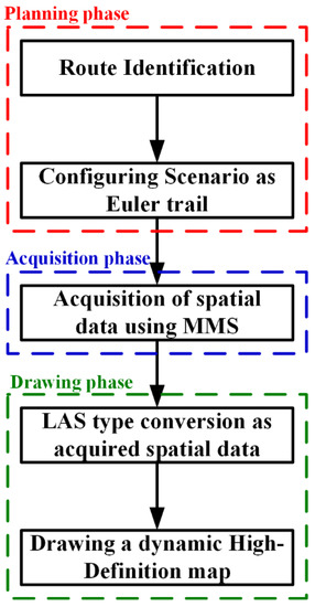 Figure 4 shows a flow chart of the multi-sensor-based MMS data-acquisition system. This paper describes a method for constructing a dynamic map and multi-sensor-based mobile mapping system (MMS) [17]. The methodology is depicted in a flowchart as presented in Figure 4. The process consists of three distinct phases: (1) planning, in which the route for collecting the data required for the dynamic map construction is devised, ensuring that it can be traversed in a single pass manner; (2) data acquisition, where the vehicle equipped, such as in Figure 3, with the MMS equipment travels along the planned route and collects the required data, and to ensure the accuracy of the collected data, the sensors are synchronized prior to data acquisition, and additional data are collected at the start and end points to facilitate sensor synchronization; (3) data processing, where the acquired data are processed, edited, and adjusted to a specific size, and if there is insufficient inter-point spacing between the start and end points of data acquisition, it may result in data degradation and the subsequent inability to construct an accurate dynamic map; and (4) converting data, where the acquisition dataset is converted into the LAS file format. The acquisition dataset is converted into processed data (the LAS file format) that can be plotted on a precision map through synchronization with a standard GNSS base station for the objectification of the acquisition data by fusing the raw data from the LIDAR sensor and the camera with the GNSS’s moving-path raw data.