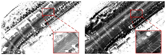 Figure 5 illustrates the phenomenon of overlapping, which occurs when the route is traversed more than twice during the planning stage, as depicted in Figure 4. The overlapped data are depicted as overlapped traffic sign markers. Vehicles equipped with the multi-sensor-based MMS cannot travel in the same areas under the same conditions (e.g., driving speed and road position between driving vehicles). Therefore, differences in the data obtained from the LIDAR sensor installed in the MMS may occur, resulting in differences and errors, as shown in Figure 5. However, when drawing a dynamic high-definition map, if some of the overlaid data are selected and drawn consistently, there will be no problems when drawing a dynamic high-definition map. In order to enhance the consistency and accuracy of precision map data, it is crucial to acquire the data by traversing the planned route in a single pass.