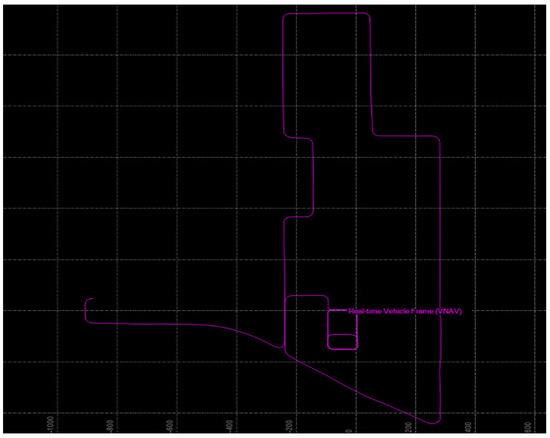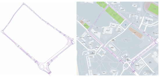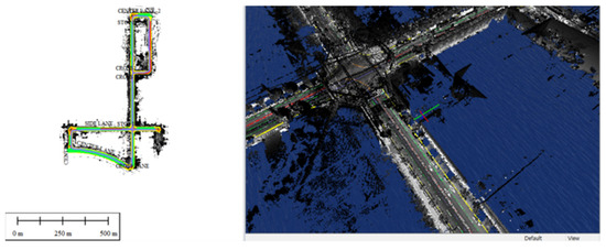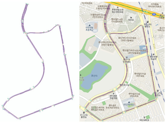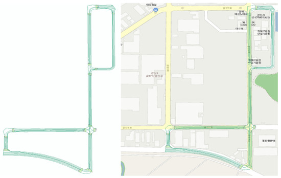 Figure 6 represents the raw GNSS-based movement path data obtained in the acquisition of spatial data. The illustration represents the space in which data were collected utilizing a vehicle equipped with the multi-sensor mapping system (MMS), with the aim of creating a high-definition dynamic map. Upon conversion into processed data in the LAS file format, the raw movement path data retain their original form.