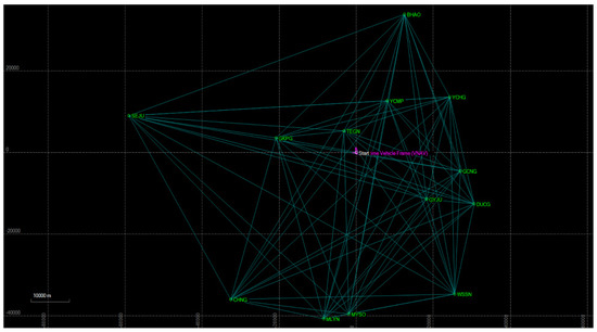 Figure 7 depicts the synchronization of GNSS observation values, which serve as the standard, with the raw data acquired from the GNSS-based movement path. In Figure 8, the acquired data are synchronized through the utilization of ten or more standard GNSS observation values in proximity to the official observation. The integration of the official observation values, represented by green points, with the movement path of the raw data, represented by purple lines, leads to an improvement in the accuracy of the GNSS data. The result of this synchronization process is the conversion of the raw data of the GNSS-based spatial acquisition into vector data, which are characterized by their spatial coordinate data components along the x-, y-, and z-axes, thus transforming the data from a general three-dimensional representation.