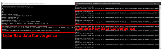Figure 8 presents the integration of the vector-processed data, the raw data obtained from LIDAR measurements, and the raw data obtained from the camera, all with their respective spatial coordinate components. The position parameter value of the LIDAR data is adjusted based on the height and length of the vehicle equipped with the MMS equipment to ensure accuracy. The result of this correction is the combination and storage of over one million LIDAR data points in the LAS file format as processed data. The raw data from the camera are also transformed into a panoramic image in the JPG format, with a resolution of 2448 × 2048 pixels.