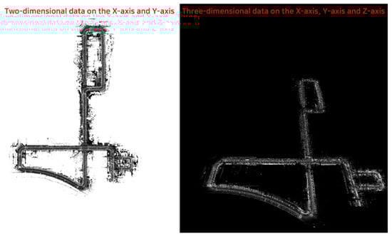 Figure 9 depicts the representation of the processed data in the form of LAS files, which serve as the fundamental data in the mapping domain, with spatial coordinate components in the x-, y-, and z-axes. Unlike conventional two-dimensional online maps, such as Google Maps, these processed data form a three-dimensional spatial map representation, providing a comprehensive and tangible spatial representation. The LAS file-format-based machined data are crucial in navigation or in the development of dynamic high-definition maps for autonomous driving, as they integrate information from LIDAR, camera, and GNSS data.