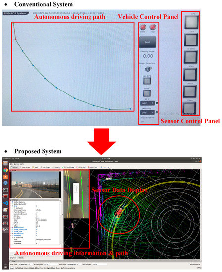 Figure 17 represents a comparison between the conventional system and the proposed system. The conventional system is a waypoint-based system utilizing GPS, which requires manual implementation of all functions prior to the start of autonomous driving. Firstly, the waypoints must be accurately entered into the autonomous driving route, and it must be verified through the user interface by pressing buttons on the sensor control panel to confirm that the sensors installed on the autonomous vehicle are functioning properly. Additionally, there is an inconvenience of having to verify through the vehicle control panel that the vehicle is communicating accurately with the existing system.
