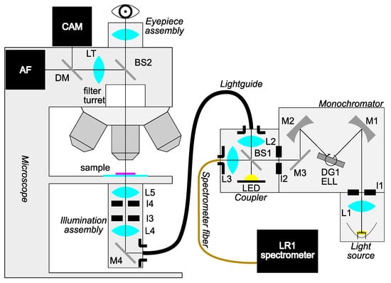 Outline of the hyperspectral microscope imaging (HMI) system setup. Light from the halogen lamp is collected by a lens and passed into a Czerny-Turner-type monochromator of custom design. Monochromatic light is then directed into the coupler, where part of the light is used for online monitoring via a spectrometer. The remaining part of the light, along with light from an optional high-power white LED used for orientation, is passed through a fiber bundle light guide. Using a custom Köhler illumination assembly, light impinges on the sample. Light from the sample is collected by an objective and passes through the microscope to either eyepieces or a camera used for data acquisition. Legend: Lx—lenses, Mx—mirrors, Ix—apertures, DG—diffraction grating, ELL—rotation stage, BS—beamsplitter, LT—tube lens, DM—dichroic mirror, CAM—camera, AF—autofocus system.