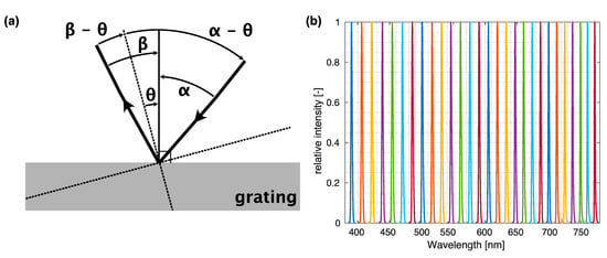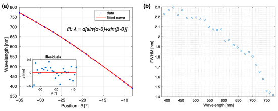 The grating constant was specified by the manufacturer and set at 555.56 nm; the parameters and were angles of the incoming and diffracted light, respectively, and varied with the rotation stage position of the grating. Parameters and were computed by fitting the Equation (4) to the measured central wavelengths and corresponding stage positions . The definition of the parameters is given in Figure 3a. The results of the fit resulting in and are displayed in Figure 4a. Because the reliability of the calibration depends strongly on the precision of stage position reading, thorough testing of repeatability and reliability was performed later in this section as part of the characterization protocol.
