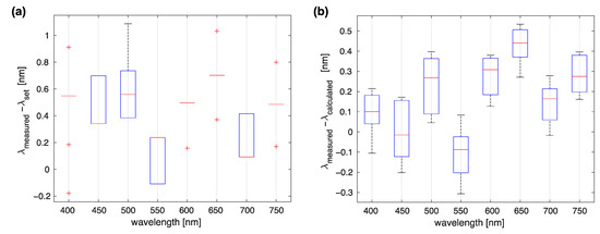 Monochromator wavelength selection repeatability. (a) Differences between the requested and spectrometer-measured wavelengths. (b) Differences between the wavelengths obtained from the calibrated encoder position compared to the spectroscopy results.