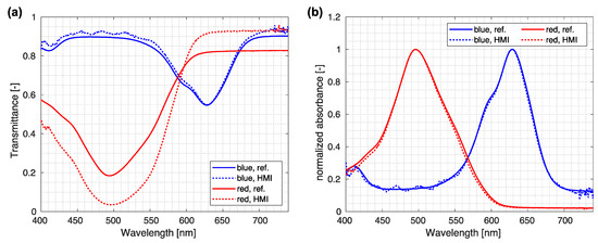 The ink cells were imaged using our custom-made HMI system. Spectra were normalized, and an averaged normalized spectrum from the central part of the sample was used for comparison. First, the raw normalized spectra were compared for both the HMI system and reference spectrometer (Figure 6). As the agreement of absolute spectra was expected to be inadequate, normalized absorbances were calculated by taking the logarithm of the transmittance value T and normalizing it to the maximal value,