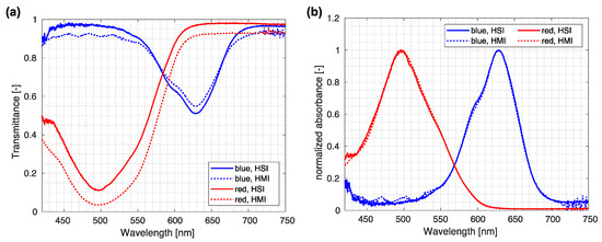 In addition, we compared the HMI spectra with those obtained by the custom-made HSI system for macroscopic samples [26,33]. Comparison between both modalities, shown in Figure 7, reveals that normalized raw spectra exhibit similar shapes, while normalized absorbance values demonstrate almost perfect agreement. An additional indicator of an excellent agreement between both modalities is the same normalization factor a = 1.05, obtained for red as well as blue ink.