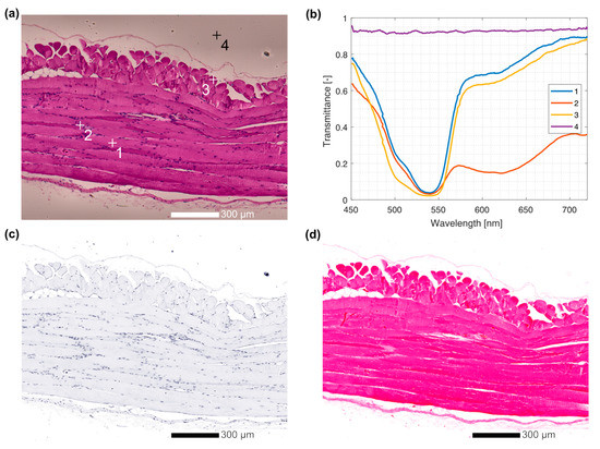 To demonstrate the use of the HMI system, we imaged a standard hematoxylin and eosin-stained histological sample of the murine abdominal wall [35,36]. The raw spectral data were first normalized by an unobstructed light field, thus normalizing the values to transmittance as well as eliminating illumination field inhomogeneity. Figure 8a shows an RGB projection of a hyperspectral cube obtained using the methods described in Section 2.3. This image is analogous to a classical RGB histology image; in fact, it appears closely similar to a standard histology image before background removal and contrast enhancement in postprocessing. Figure 8b shows spectra selected from the image shown in Figure 8a at three different points on the sample itself and at one point on a section containing only glass without tissues.