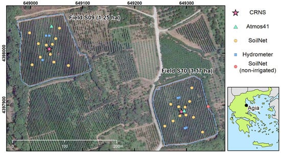 The study area was located near Agia (Greece) and was part of the Pinios Hydrologic Observatory (PHO) [], which belongs to the Pinios River basin and is among the most productive agricultural areas in Greece. The PHO is a member-site of the Hellenic and International long-term ecosystem research (LTER) network. It is characterized by Mediterranean climate, with annual average temperatures of 15 °C and yearly precipitation amounts between 500 and 1200 mm. Irrigation is commonly employed in the PHO due to the generally scarce summer precipitation, and irrigation water demand is generally met by groundwater abstraction []. Within the PHO, two apple orchards were selected for this study, namely field S09 and field S10 (Figure 1). These fields are part of the pilot fields established in the context of the ATLAS project (https://www.atlas-h2020.eu/, 29 December 2022) and are used for the development of data-driven irrigation services. They are part of the Oikonomou farm, which holds ~7 ha of apple orchards in the area. The investigated fields had a mild south-oriented slope (<5%), and areas of 1.25 ha (field S09) and 1.17 ha (field S10). The area that surrounded the investigated fields was characterized by a gentle and constant slope (generally < 7%), with a north–south orientation. Steeper slopes were only found 400 m northwest of field S09 or beyond. Both fields were equipped with micro sprinkler irrigation systems and were irrigated weekly, generally towards the end of each week.