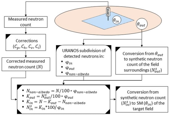 - Finally, the synthetic neutron count is obtained using . This is then used in Equation (6) to estimate the SM in the irrigated field ().