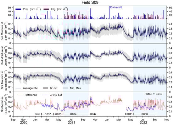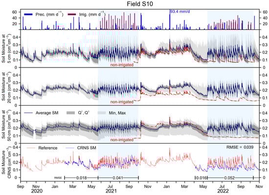 In the upper panel: precipitation for field S10, and irrigation for field S09 in mm d−1. In the three central panels: SM recorded from the SoilNet network of field S09 at 5, 20, and 50 cm depths. Dark grey areas indicate the first and third quartile, whereas the light grey area indicates maximum and minimum values for the SM of these panels. In the bottom panel: reference SM from weighting the SoilNet network and CRNS-derived SM for field S09. Regressions of these measurements are provided in Appendix C.