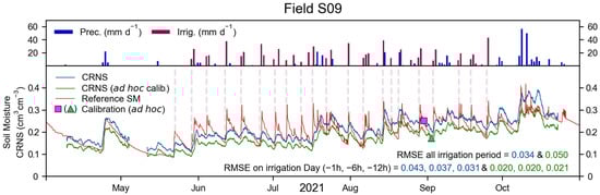 The precipitation, irrigation, reference SM, and CRNS-derived SM for field S09, during the 2021 irrigation period, are shown in Figure 5. A total of 21 irrigation events took place in field S09. Of these, 20 were recorded by the water meters, whereas one irrigation event was performed before the installation of the monitoring system. These irrigation events generally happened towards the end of each week, but were heterogeneous in time and quantity of water. Nonetheless, irrigation resulted in changes in SM within field S09 that were apparent in the reference SM dynamics (bottom panel of Figure 5). The CRNS-derived SM could partially capture the timing of an irrigation event. However, the magnitude of the SM variation, especially during and immediately after an irrigation event, was underestimated, resulting in a RMSE of 0.034 cm3 cm−3.