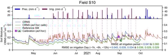 For field S10, during the 2021 irrigation period: precipitation, irrigation, reference SM, and CRNS-derived SM obtained with a standard calibration procedure (blue line and pink square) and with an ad hoc calibration procedure (green line and triangle). The RMSE of the entire irrigation period and at one, six, and twelve hours before irrigation is shown in the bottom panel. Irrigation dates selected for the RMSE calculation are marked with red, vertical, dashed lines. Regressions of these measurements are provided in Appendix C.