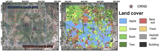 The land use of the study area and the extent of the simulated domains are shown in Figure 7. North of the two CRNSs, natural land use is prevalent (i.e., bare soil, grass, bush, and tree). The southern half of the simulated domains, on the contrary, is dominated by irrigated orchards (apple and cherry). Buildings, asphalt roads, and tracks are found locally and only represent a small portion of the domains. Overall, in the surroundings of the target fields, irrigated fields cover 29.0% and 31.4% of the domain for field S09 and S10, respectively.