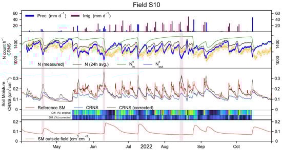 In the following, the variables measured in the two investigated fields, S09 and S10, are discussed, and the CRNS-derived SM is compared with the reference SM obtained from the SoilNet networks. In this comparison, it should be noted that reference the SM was obtained from SoilNet nodes that are solely located within the irrigated field. Thus, the reference SM was not influenced by the field surroundings. Given that, for the CRNSs used in this study, the sensing volume was larger than the relatively small target fields (1.17 and 1.25 ha), a large part of the detected neutrons that have soil contact can be expected to originate in the surroundings. This has an influence on the measured neutron count rates, and a direct comparison between CRNS-derived SM and the selected reference could be considered unbalanced, especially when SM inside and outside the irrigated fields differ considerably. However, the scope of this study is to test CRNS for the retrieval of SM information within the irrigated field, which justifies the use of the selected methodologies and comparisons, even if the CRNS is put in a generally unfavourable testing environment.