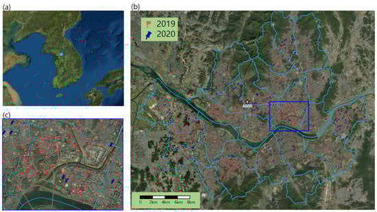 Location of (a) Seoul in Korea, (b) S-DoT stations installed in 2019 and 2020, and ASOS station (star) in Seoul City, and (c) enhanced location of S-DoT stations in Seongdong District (blue rectangle in (b)) in Seoul.