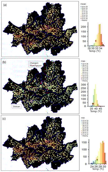 Horizontal distribution of daily (a) mean, (b) maximum, and (c) minimum temperatures on 24 July 2021, obtained by the S-DoT IoT meteorological sensors. The occurrence frequency for temperature is shown in the right bottom histogram. The values observed by Seoul ASOS are indicated by a red star.