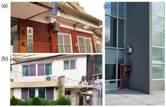 Most S-DoT stations were installed over realistic urban areas surrounded by middle- or high-rise compact buildings in downtown areas (87%), while some were installed near mountains or parks (4%) and riversides (9%) (Table 1). Most downtown stations were located in residential, roadside, or commercial areas. Enclosures were mostly installed at 3–4 m on streetlight polls, closed-circuit television polls, or smart polls, while some were installed on the wall of a building directed to the east, south, west, or on a rooftop.