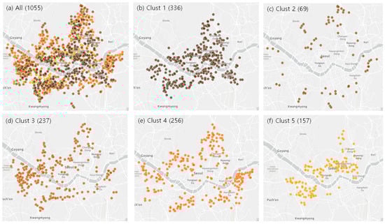 Location of (a) all stations and (b) Cluster 1, (c) Cluster 2, (d) Cluster 3, (e) Cluster 4, and (f) Cluster 5 stations.