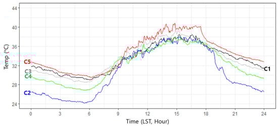 The stations can be clustered according to temporal variation patterns. In this study, the time series of all stations were classified into 5 clusters using the dynamic time warping (DTW) clustering technique (Figure 4) [,]. Figure 5 shows the time series of centroid temperatures for each cluster. Cluster 1, which had stations in the urban center, showed normal temperatures during the day and higher temperatures at night. Cluster 2, which had stations near the mountainous areas, showed much lower temperatures at night and slightly lower temperatures during the day. Cluster 3 was similar to Cluster 1, but the former exhibited slightly higher temperatures during the day and similar temperatures at night. The distribution of Cluster 3 was also similar to that of Cluster 1, but Cluster 3 was concentrated in the western part of Seoul, whereas Cluster 1 was evenly scattered throughout downtown Seoul. Further, Cluster 4 exhibited a slightly lower temperature at night, and was located between Clusters 1 and 2, and Cluster 5, which had stations in the center of the downtown areas, showed much higher temperatures during both the day and night. Cluster analyses implied that Seoul city could be classified into several climate zones according to the location of the station.