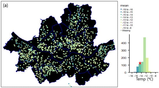 Figure 6 shows the horizontal distribution of the daily mean, maximum, and minimum temperatures on the coldwave event day. The spatially averaged daily mean temperature was −12.9 °C, which was higher by 2.0 °C than that of the ASOS (Figure 6a). Further, 91% of the S-DoT stations showed a higher daily mean temperature than the temperature recorded at the ASOS, whereas only 9% showed lower mean values. The spatially averaged maximum temperature was −8.4 °C, which was higher by 2.3 °C than that recorded by the Seoul ASOS (Figure 6b). Moreover, 91% of the S-DoT stations exhibited a higher maximum temperature than the ASOS. The spatial average of the minimum temperature was −16.2 °C, which was higher by 1.6 °C than that recorded by the ASOS. Furthermore, 95% of the stations showed a higher minimum temperature than the ASOS, whereas only 5% showed a lower minimum temperature (Figure 6c).