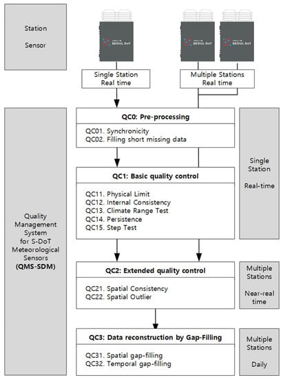A quality management system for an IoT meteorological sensor network was developed. The QMS was applied to Seoul S-DoT, one of the largest and most diverse big data globally. The S-DoT sensors were installed over realistic urban areas, such as downtown areas, urban parks, and river sides, and not on ideal surfaces. The local climate zones near IoT network stations differed completely from those operated by the National Meteorological Administration [,]. Owing to irregular data transmission, the observation time was not regular. Some missing data were recorded as zero, which could not be distinguished from an observed zero value. Before the main quality control, a pre-processing step was added to unify the format.