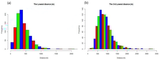 Histogram of (a) the shortest and (b) the third-shortest distance between two stations.