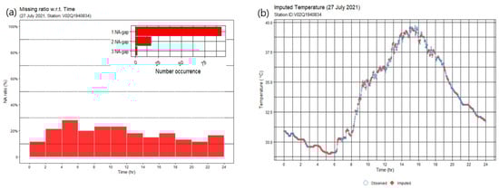 Most stations had many random missing data during a short period of less than 6 min. Figure 9a shows an example of the missing data ratio at every 2 h interval at a station on 27 July 2021. In total, there were 133 missing (NA, not available) temperature data points from 720 data points. Among them, there were 93 missing data for a single time and 17 missing data for 4 min (two consecutive times). Missing patterns were nearly random.
