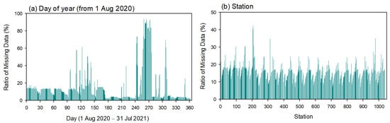 The daily missing data ratio depended on the day of the year and was extremely high (up to 80%) in April 2021, and low in the other months of 2021, except for some periods (Figure 10a). Missing ratios at most stations fell within the range of 10–20%. However, a sinusoidal periodic pattern was observed with respect to the station’s alphabetical order. This result may be due to data incomplete telecommunication failure from the site to the server. Thus, >98% of the missing data were imputed.