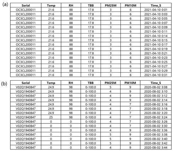 Figure 11 shows an example of errors found using persistence and step checks. None of the data including temperature, relative humidity, PM2.5, and PM10 changed with time (Figure 11a). Contrastingly, all data were 0 at a given time (Figure 11b). Temporal differences in temperature (25 °C) and relative humidity (98%) were above the threshold values of 3 °C and 10%, respectively.