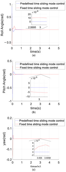 Attitude error comparison between the predefined-time sliding mode control and the fixed-time sliding mode control. (a) Roll-Angle error curve. (b) Pitch-Angle error curve. (c) Yaw-Angle error curve.
