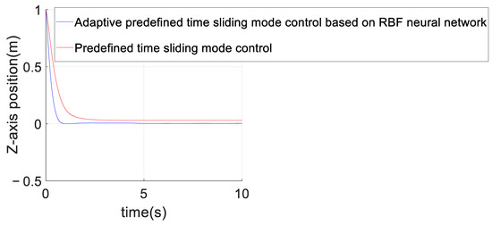Comparison of Z-axis position error between the adaptive predefined-time sliding mode control based on the RBF neural network and the predefined-time sliding mode control.