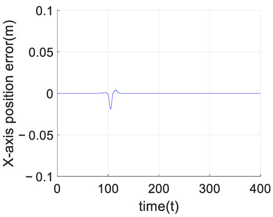 Figure 9 shows the comparison between the planned trajectory and the real trajectory of the quadrotor formation with obstacles. According to that, we can see the planned trajectory can be prevented from falling into local optimal when encountering obstacles by adding virtual force to the artificial potential field method, which can help the formation successfully bypass the obstacles and finally return to the planned path. At the same time, each quadrotor can stably track the planned trajectory under the control of the adaptive predefined-time sliding mode control algorithm based on the RBF neural network, able to stably track the planned trajectory. Taking the leader as an example, this paper shows the error curve of the leader tracking the planned trajectory on the axes in Figure 11, Figure 12 and Figure 13. It can be seen that the quadrotor can track the planned trajectory stably and quickly under the control of the adaptive pre-defined time sliding mode control algorithm based on the RBF neural network, and the maximum tracking error in the obstacle avoidance process will not exceed .