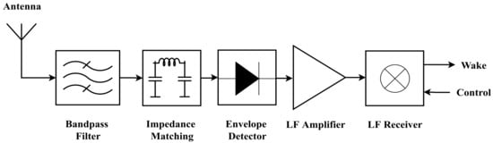 Figure 3 shows the building blocks of an 868 MHz WuRx utilizing an envelope detector, an LF amplifier to increase the sensitivity of the radio chip, and an LF receiver for pattern recognition and interruption of the primary transceiver during its sleep mode. WuRx, being a recent representative of this low-frequency pattern matcher (LFPM), is the main focus of this article.