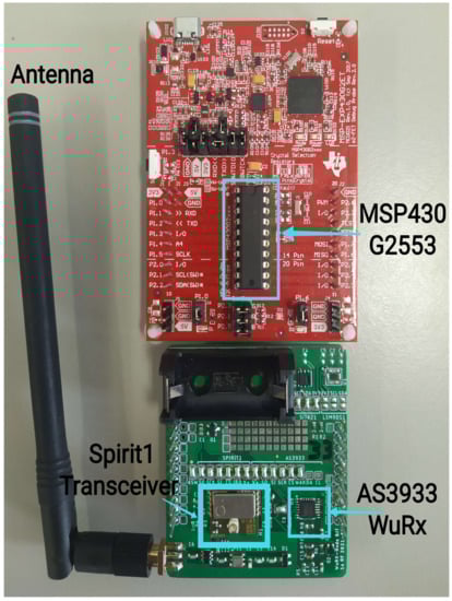 In this work, the hardware of the WuRx node was composed of a SPIRIT1 transceiver that sent the WUC signals to the COTS WuRx with an integrated LFPM AS3933. Both the radio and COTS WuRx hardware were attached to a Texas Instrument microcontroller MSP430G2553, as shown in